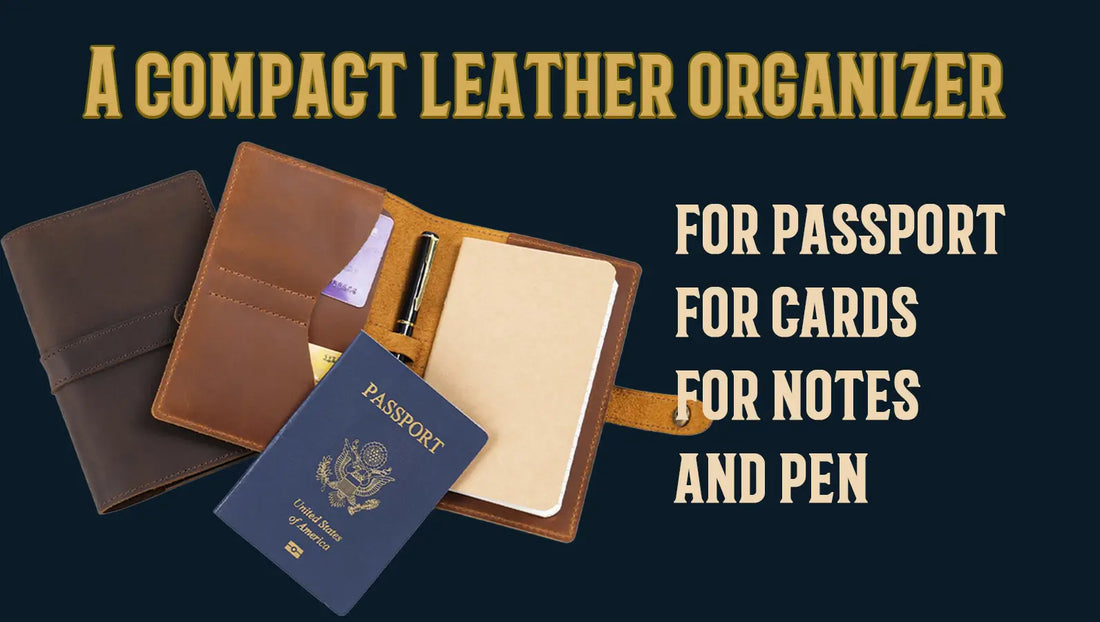 Passport, cards, notes, and pen—all in one handcrafted leather cover. Available in 3 colors with custom engraving.